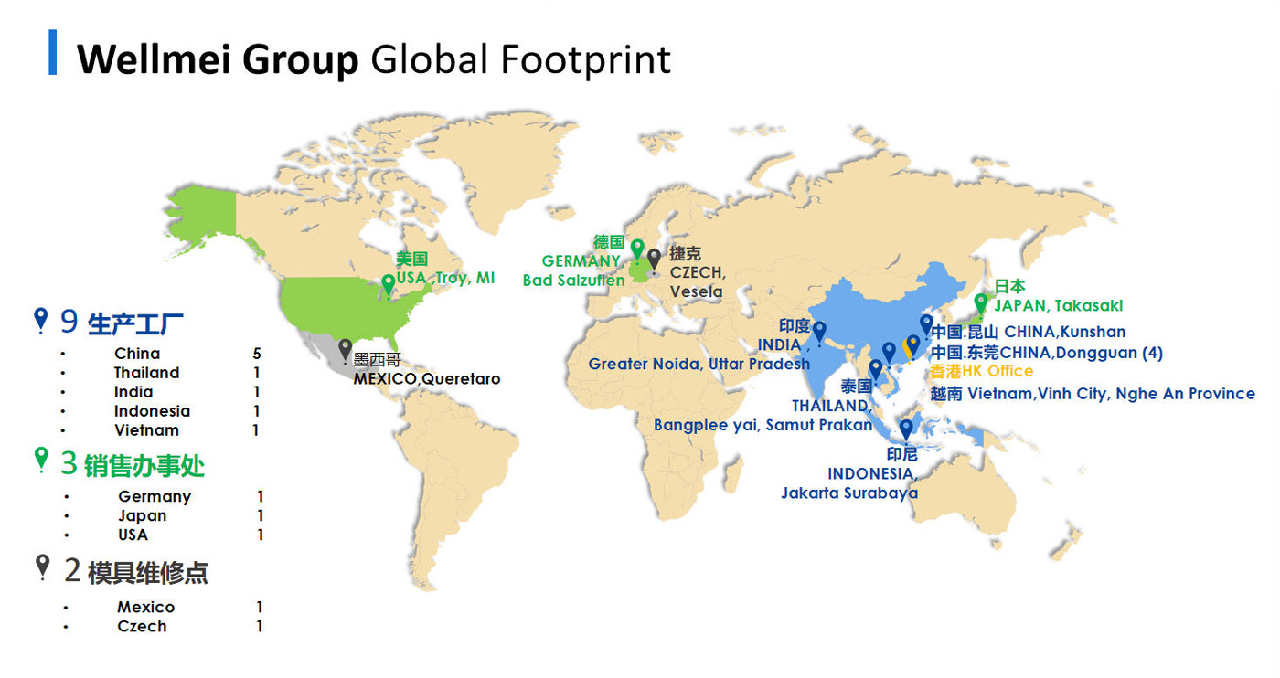 現(xiàn)在集團(tuán)旗下大陸地區(qū)有5家國(guó)家級(jí)高新技術(shù)企業(yè),在泰國(guó)、印度、印尼各有1家子公司,在日本、美國(guó)、歐洲分別設(shè)有辦事處,業(yè)務(wù)遍及全球幾十個(gè)國(guó)家和地區(qū),為客戶提供一站式模具和注塑解決方案,現(xiàn)已成為擁有精密模具、精密塑膠以及精密零部件為一體的大型綜合性高科技集團(tuán)企業(yè)。